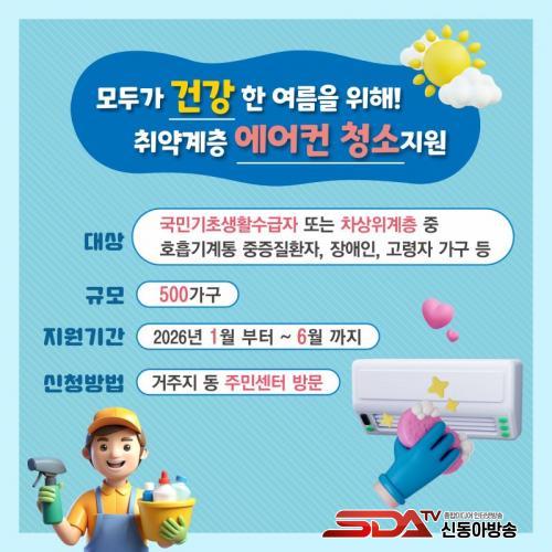 À̹ø ¿¡¾îÄÁ û¼Ò Áö¿øÀº Æø¿°À¸·Î ³Ã¹æ±â »ç¿ëÀÌ ´Ã¾î³ª´Â ¹Ý¸é °æÁ¦Àû »çÁ¤À¸·Î °ü¸®°¡ ¾î·Á¿î Ãë¾à°èÃþ °¡±¸ÀÇ ºÎ´ãÀ» ´ú±â À§ÇÑ Á¶Ä¡´Ù. ±¸´Â ¿¡¾îÄÁ ³»ºÎ ¿À¿°À¸·Î ÀÎÇÑ È£Èí±â Áúȯ À§ÇèÀ» ³·Ãß°í ³Ã¹æ È¿À²À» ³ôÀ̱â À§ÇØ Àú¼Òµæ °¡±¸ °¡¿îµ¥ È£Èí±â °èÅë ÁßÁõÁúȯÀÚ, Àå¾ÖÀÎ, °í·ÉÀÚ µîÀ» ¿ì¼± ´ë»óÀ¸·Î 500°¡±¸¸¦ ¼±Á¤ÇØ Áö¿øÇÒ °èȹÀÌ´Ù.