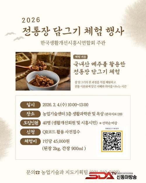 üÇèÇà»ç´Â 1¿ù 25ÀϺÎÅÍ 2¿ù 1ÀϱîÁö »çÀü ½ÅûÀ» ÅëÇØ Âü¿©ÇÒ ¼ö ÀÖÀ¸¸ç, üÇèºñ´Â 1°èÁ´ç 45,000¿ø(µÈÀå 2kg, °£Àå 900ml Æ÷ÇÔ)ÀÌ´Ù. ÀÚ¼¼ÇÑ »çÇ×Àº ½ÃÈï½Ãû ´©¸®Áý °Ë»öâ¿¡¼ ¡®ÀüÅë Àå ´ã±×±â¡¯¸¦ °Ë»öÇϸé È®ÀÎÇÒ ¼ö ÀÖ´Ù.