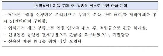 Çѱ¹¼ÒºñÀÚ¿ø 1372 ¼ÒºñÀÚ»ó´ã¼¾ÅÍ Á¢¼ö ÇöȲÀ» º¸¸é 2024³â 0°Ç, 2025³â 1°Ç¿¡ ºÒ°úÇßÀ¸³ª, 2026³â 1¿ù 25°Ç, 2¿ù 1°Ç µî µÎ ´Þ°£ 26°ÇÀÌ Á¢¼öµÆ´Ù. 2024³âºÎÅÍ 2026³â 2¿ù±îÁö ´©Àû 27°Ç °¡¿îµ¥ 26°Ç(¾à 96%)ÀÌ 2026³â¿¡ ÁýÁßµÅ, ¿ÃÇØ µé¾î ¼ÒºñÀÚ ºÒ¸¸ÀÌ º»°ÝÀûÀ¸·Î Ç¥¸éÈµÈ °ÍÀ¸·Î ºÐ¼®µÈ´Ù.