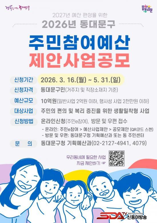 ÃÑ 10¾ï ¿ø ±Ô¸ð·Î ÁøÇàµÇ´Â 2026³â µ¿´ë¹®±¸ ÁÖ¹ÎÂü¿©¿¹»ê»ç¾÷Àº ÁÖ¹ÎÀÇ ÆíÀÇ ¹× º¹¸® ÁõÁøÀ» À§ÇÑ »ýȰ¹ÐÂøÇü »ç¾÷À» ´ë»óÀ¸·Î ÇÑ´Ù. µ¿´ë¹®±¸¿¡ °ÅÁÖÇϰųª ±Ù¹«ÇÏ´Â ÁֹΠ´©±¸³ª µ¿´ë¹®±¸ ´©¸®Áý, ÁÖ¹ÎeÂü¿© ´©¸®Áý ¶Ç´Â ±¸Ã»¡¤Áֹμ¾ÅÍ ¹æ¹®À̳ª ¿ìÆíÀ¸·Î ½ÅûÇÒ ¼ö ÀÖ´Ù. ´Ü, ÀÌ¹Ì ÃßÁø ÁßÀÎ »ç¾÷À̳ª ƯÁ¤ÀΡ¤´Üü¸¦ À§ÇÑ »ç¾÷ µîÀº Á¦¿ÜµÈ´Ù.