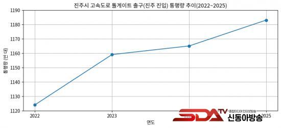 ¶ÇÇÑ °í¼Óµµ·Î ÅëÇà·®¿¡¼µµ Áõ°¡ È帧ÀÌ È®ÀεƴÙ. Çѱ¹µµ·Î°ø»ç ÀÚ·á¿¡ µû¸£¸é ÁøÁÖ¡¤¹®»ê(µ¿ÁøÁÖ)¡¤¼ÁøÁÖ¡¤Áø¼º¡¤Áö¼ö µî ÁøÁֽà 5°³ Åç°ÔÀÌÆ® Ãⱸ(ÁøÁÖ·Î µé¾î¿À´Â Â÷·®) ÅëÇà·®Àº 2022³â 1124¸¸ ´ë¿¡¼ 2025³â 1183¸¸ ´ë·Î ¾à 59¸¸ ´ë(¾à 5.2%) Áõ°¡ÇÑ °ÍÀ¸·Î ³ªÅ¸³µ´Ù. ¿¬µµº°·Î´Â 2022³â 1124¸¸ ´ë, 2023³â 1159¸¸ ´ë, 2024³â 1165¸¸ ´ë, 2025³â 1183¸¸ ´ë·Î Áý°èµÆ´Ù.