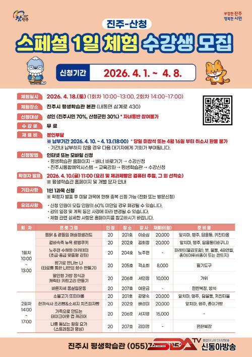 ¼ö° ½ÅûÀº ÁøÁֽà Æò»ýÇнÀ°ü ´©¸®Áý¿¡¼ ÇÏ¸é µÈ´Ù. ¿ä¸® ¹× Á¦°ú¡¤Á¦»§ °ú¸ñÀº ÄÄÇ»ÅÍ Ãß÷À¸·Î ¼ö°»ýÀ» ¼±¹ßÇϸç, ±× ¿Ü °ú¸ñÀº ¼±Âø¼øÀ¸·Î Á¢¼öÇÑ´Ù. ¼ö°·á´Â ¹«·áÀ̸ç, ÀϺΠ°ú¸ñÀÇ °æ¿ì Àç·áºñ´Â Âü°¡ÀÚ°¡ ºÎ´ãÇØ¾ß ÇÑ´Ù.