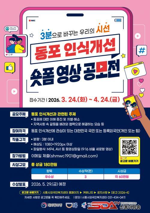À̹ø °ø¸ðÀüÀº ±¹³» °ÅÁÖ ¿Ü±¹±¹Àûµ¿Æ÷¿¡ ´ëÇÑ »çȸÀû ÀνÄÀ» °³¼±Çϰí, ´Ù¾çÇÑ ¹®ÈÀû ¹è°æÀ» Á¸ÁßÇϸç ÇÔ²² »ì¾Æ°¡´Â Áö¿ª»çȸÀÇ ¸ð½ÀÀ» ´ãÀº ¿µ»ó ÄÜÅÙÃ÷¸¦ ¹ß±¼Çϱâ À§ÇØ ¸¶·ÃµÆ´Ù. ÀÏ»ó ¼Ó °¥µîÀ» ¹è·Á¿Í Çù·ÂÀ¸·Î ÇØ°áÇÏ´Â »ç·Ê, Àç¿Üµ¿Æ÷¿¡ ´ëÇÑ ±àÁ¤Àû ÀÎ½Ä È®»ê À̾߱â, Áö¿ª»çȸ ¼Ò¼Ó°¨°ú ÀÚ±à½ÉÀ» ³ôÀÌ´Â ¸Þ½ÃÁö µîÀ» ÁÖÁ¦·Î ÇÑ´Ù.