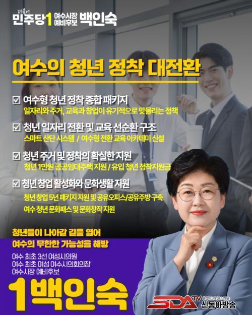 ¹éÀμ÷ ¿©¼ö½ÃÀå ¿¹ºñÈ帴 "û³âÁ¤Ã¥Àº ¸î Ǭ Áö¿øÇÏ´Â º¹Áö°¡ ¾Æ´Ï¶ó µµ½ÃÀÇ Ã¼ÁúÀ» ¹Ù²Ù´Â »ýÁ¸Àü·«"À̶ó¸ç "1¸¸¿ø ÁÖÅÃ, 3³â 600¸¸¿ø ±Ù¼ÓÀå·Á±Ý, 3³â 1000¸¸¿ø Á¤ÂøÁö¿ø, ¿¬ 30¸¸¿ø ¹®ÈÆÐ½º·Î û³âÀÌ µ¹¾Æ¿À´Â ¿©¼ö¸¦ ¸¸µé°Ú´Ù"°í ¹àÇû´Ù.