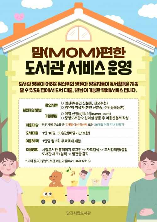 [½Åµ¿¾Æ¹æ¼Û=ÀÌÀçö±âÀÚ] ´çÁø½Ã´Â µµ¼­°ü ¹æ¹®ÀÌ ¾î·Á¿î ½Ã¹ÎµéÀ» À§ÇØ ´çÁø½Ã¸³µµ¼­°ü¿¡¼­ ¡®¸¾(MOM)ÆíÇÑ µµ¼­°ü ¼­ºñ½º¡¯¿Í ¡®¾î¸£½Å µµ¼­ ´ëÃâ ÅÃ¹è ¼­ºñ½º¡¯¸¦ ¿î¿µÇϰí ÀÖ´Ù°í 27ÀÏ ¹àÇû´Ù. ¡®¸¾(MOM)ÆíÇÑ µµ¼­°ü ÅÃ¹è ¼­ºñ½º¡¯´Â ´çÁø½Ã¿¡ °ÅÁÖÇÏ´Â 7°³¿ù ÀÌ¡¦
