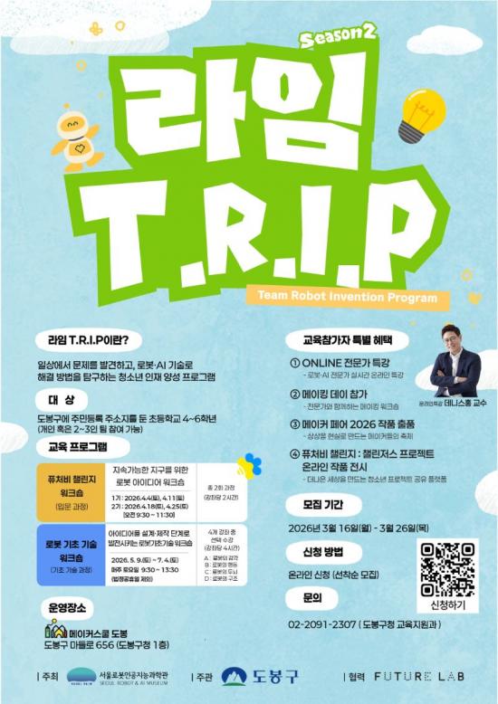 [½Åµ¿¾Æ¹æ¼Û µµºÀ±¸=À̽ŵ¿±âÀÚ] ¼­¿ï µµºÀ±¸°¡ ¼­¿ï·Îº¿ÀΰøÁö´É°úÇаü(RAIM)ÀÌ ÁÖÃÖÇÏ´Â '2026³â RAIM T.R.I.P(µ¿Çà ·Îº¿ ¹ß¸íÇÁ·Î±×·¥)' Âü¿© ÀÚÄ¡±¸·Î ¼±Á¤µÆ´Ù°í ¹àÇû´Ù. ÀÌ¿¡ µû¶ó ±¸´Â ¼­¿ï·Îº¿ÀΰøÁö´É°úÇаü(RAIM)°ú ÇÔ²² ÃʵîÇб³ 4~6Çгâ Çлý ´ë»óÀ¸·Î ¡¦