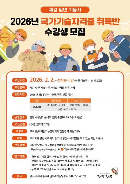[½Åµ¿¾Æ¹æ¼Û=ÀÌÀçö±âÀÚ] ´çÁø½Ã´Â Áö¿ª ÀÎÀçÀÇ Á÷¹« ¿ª·® °­È­¿Í Ãë¾÷ °æÀï·Â Á¦°í¸¦ À§ÇØ ¡®2026³â ±¹°¡±â¼úÀÚ°ÝÁõ Ãëµæ ¹Ý¡¯ ¼ö°­»ýÀ» ¼ö½Ã ¸ðÁýÇÑ´Ù°í 23ÀÏ ¹àÇû´Ù. À̹ø ±³À° °úÁ¤Àº Á¦°­ ±â´É»ç¿Í ¾Ð¿¬±â´É»ç ÀÚ°Ý ÃëµæÀ» ¸ñÇ¥·Î ¿î¿µÇϸç, »ê¾÷ ÇöÀå¿¡¼­ Ȱ¿ë¡¦