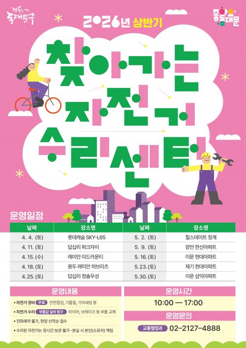 [½Åµ¿¾Æ¹æ¼Û µ¿´ë¹®±¸=À̽ŵ¿±âÀÚ] ¼­¿ï µ¿´ë¹®±¸´Â ÀÚÀü°Å ÀÌ¿ëÀ» Ȱ¼ºÈ­Çϰí ģȯ°æ ±³Å빮ȭ¸¦ È®»êÇϱâ À§ÇØ 4¿ùºÎÅÍ ¡®2026 ã¾Æ°¡´Â ¼ö¸®¼¾ÅÍ¡¯¸¦ º»°Ý ¿î¿µÇÑ´Ù°í ¹àÇû´Ù. °íÀå ³­ ÀÚÀü°Å¸¦ ¼ö¸®Á¡±îÁö ¿Å°Ü¾ß ÇÏ´Â ºÒÆíÀ» ÁÙÀ̰í, ¹æÄ¡µÈ ÀÚÀü°Å·Î ÀÎÇÑ ¾È¡¦