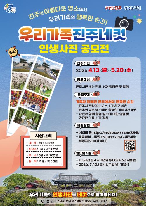 [½Åµ¿¾Æ¹æ¼Û °æ³²ÁøÁÖ=±è¸í¼ö±âÀÚ] ÁøÁֽô °¡Á·°ú ÇÔ²²ÇÑ ÀÏ»ó ¼Ó ÇູÇÑ ¼ø°£À» °øÀ¯ÇÏ°í °¡Á· ģȭÀû °¡Ä¡¸¦ È®»êÇϸç Áö¿ª¿¡ ´ëÇÑ ¾ÖÇâ½ÉÀ» ³ôÀ̱â À§ÇØ 2026³â Àα¸Á¤Ã¥ ¡¸¿ì¸® °¡Á· ÁøÁÖ ³× ÄÆ¡¹ Àλý»çÁø °ø¸ðÀüÀ» °³ÃÖÇÑ´Ù. À̹ø °ø¸ðÀüÀº ÁøÁÖÀÇ °ü±¤ ¸í¼Ò¡¦