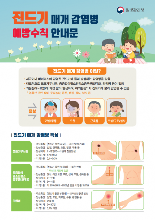 ÂêÂê°¡¹«½ÃÁõÀº 10¿ù~11¿ù¿¡ ÁýÁß ¹ß»ýÇÏ´Â Áøµå±â ¸Å°³ °¨¿°º´À¸·Î, ¾ß¿ÜȰµ¿ ÈÄ 10ÀÏ À̳»¿¡ ¹ß¿, ¿ÀÇÑ, ±ÙÀ°ÅëÀÇ Áõ»ó°ú ¸ö¿¡ °ËÀº µüÁö°¡ ¹ß°ßµÇ¸é ÂêÂê°¡¹«½ÃÁõÀ» ÀǽÉÇØ¾ß ÇÑ´Ù.
