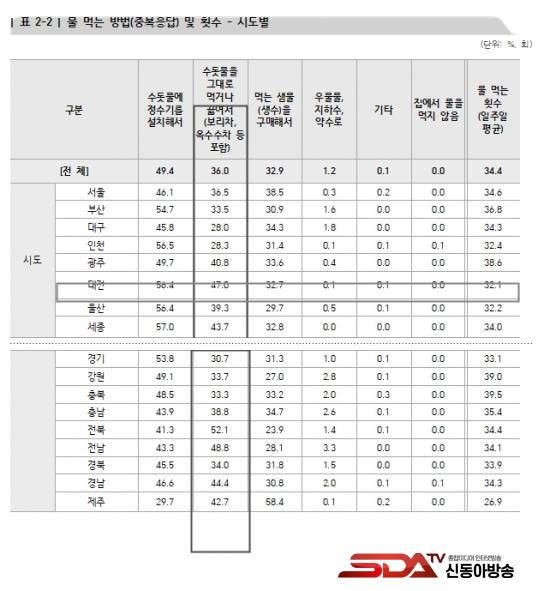ÇöÇà ¼öµµ¹ý¿¡ µû¶ó Àü±¹ ½Ã¡¤±ºÀ» ´ë»óÀ¸·Î 3³â¸¶´Ù ÀÌ·ïÁö´Â ÇØ´ç ½ÇÅÂÁ¶»ç¿¡¼­ 2021³â ±âÁØ ÀÎõ Áö¿ª 1õ530°¡±¸ Áß ¡®¼öµ¾¹°À» ±×´ë·Î ¸Ô°Å³ª ²ú¿©¼­ ¸¶½Å´Ù¡¯´Â ÀÀ´äÀº 28.3%¿´´Ù. Àü±¹ 17°³ ½Ãµµ °¡¿îµ¥ ´ë±¸(28.0%) ´ÙÀ½À¸·Î ³·Àº 16À§¿¡ ÇØ´çÇÏ´Â ¼öÄ¡´Ù.