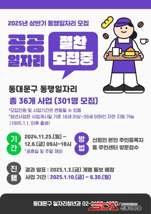 ¡®µ¿ÇàÀÏÀÚ¸®»ç¾÷¡¯Àº °ø¿ø ȯ°æÁ¤ºñ µî 36°³ÀÇ °ø°øºÎ¹® »ç¾÷À» ÅëÇØ Á÷Á¢ÀÏÀÚ¸®¸¦ Á¦°øÇÏ´Â »ç¾÷ÀÌ´Ù. ½Åû ÀÚ°ÝÀº »ç¾÷ °³½ÃÀÏ ±âÁØ 18¼¼ ÀÌ»ó ±Ù·Î ´É·ÂÀÚ·Î, µ¿´ë¹®±¸¿¡ ÁÖ¼Ò¸¦ µÐ Ãë¾÷Ãë¾à°èÃþ µî »ý°è Áö¿øÀÌ ÇÊ¿äÇÑ ÁÖ¹ÎÀÌ´Ù. ¶ÇÇÑ ±âÁØ ÁßÀ§¼Òµæ 80% ÀÌÇÏÀÌ¸ç °¡±¸¿ø ÇÕ»ê Àç»ê ¹× ¼ÒµæÀÌ 4¾ï ¿ø ÀÌÇÏÀÎ °æ¿ì¿¡ ÇØ´çµÈ´Ù.