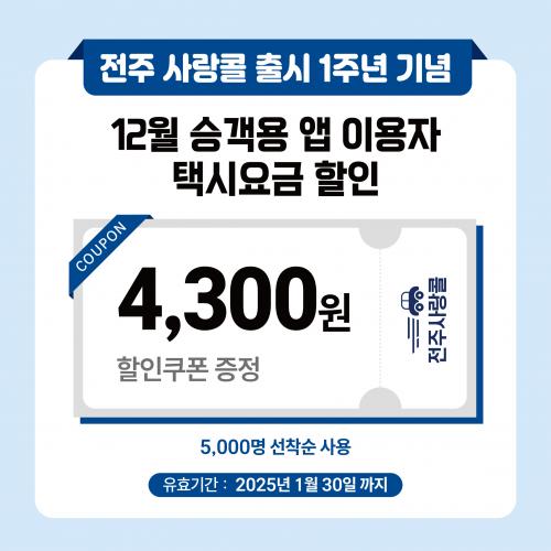 ÀÌ¿¡ ÀüÁÖ»ç¶ûÄÝÀº 1ÁÖ³â °í°´ °¨»ç À̺¥Æ®·Î 12¿ù Áß 1ȸ ÀÌ»ó ¾ÛÀ» ÀÌ¿ëÇÑ °í°´ 5000¸í¿¡°Ô ¼±Âø¼øÀ¸·Î 4300¿ø »ó´çÀÇ ±âº»¿ä±Ý ÄíÆùÀ» Áö±ÞÇÑ´Ù. ÇØ´ç ÄíÆùÀº ÀüÁÖ»ç¶ûÄÝ ¾Û ÄíÆùÇÔ¿¡¼ È®ÀÎÇÒ ¼ö ÀÖ´Ù.