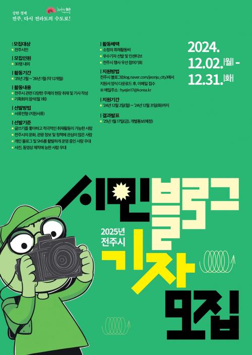 ÃÑ 30¸í ³»¿Ü·Î ¼±¹ßÇÒ ¿¹Á¤ÀÎ 2025³â ½Ã¹Î ºí·Î±× ±âÀÚ´ÜÀº ÀüÁÖ¿¡ °ÅÁÖÇÏ´Â »ç¶÷ÀÌ¸é ´©±¸³ª Áö¿øÇÒ ¼ö ÀÖÀ¸¸ç, ÇÕ°ÝÀÚ´Â ³»³â 1¿ù 17ÀÏ ¹ßÇ¥µÉ ¿¹Á¤ÀÌ´Ù.