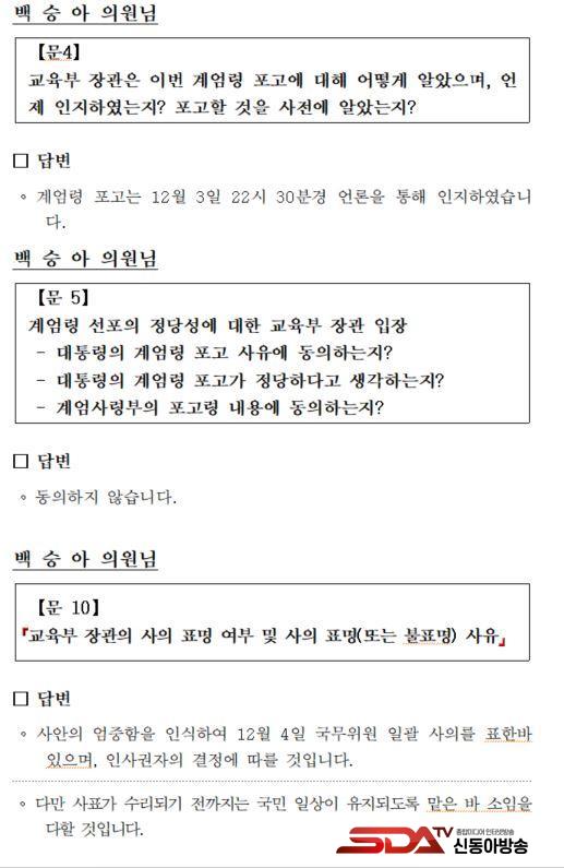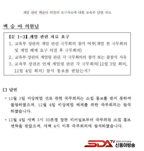 ¡à ±¹È¸ ±³À°À§¿øÈ¸ ¹é½Â¾Æ ÀÇ¿ø(´õºÒ¾î¹ÎÁÖ´ç)ÀÌ °ø°³ÇÑ ¡®±³À°ºÎ Àå°üÀÇ °è¾ö °ü·Ã ±¹¹«È¸ÀÇ Âü¼® ¿©ºÎ¡¯ µîÀ» ¹¯´Â ±³À°ºÎ ¼¸é´äº¯ ÀÚ·á¿¡ µû¸£¸é, ±³À°ºÎ´Â ¡°12¿ù 3ÀÏ ºñ»ó°è¾ö ¼±Æ÷ °ü·Ã ±¹¹«È¸ÀÇ´Â ¼ÒÁý Å뺸¸¦ ¹ÞÁö ¸øÇÏ¿© ºÒÂüÇÏ¿´À¸¸ç, 12¿ù 4ÀÏ ºñ»ó°è¾ö ÇØÁ¦¸¦ À§ÇÑ ±¹¹«È¸ÀÇ´Â Âü¼®ÇÏ¿´½À´Ï´Ù.¡±, ¡°12¿ù 4ÀÏ »õº® 3½Ã 30ºÐ°æ Àå°ü ºñ¼½Ç·ÎºÎÅÍ ±¹¹«À§¿ø ¼ÒÁý Å뺸 ¿¬¶ôÀ» ¹Þ¾ÒÀ¸¸ç, »õº® 4½Ã ÀÌÈÄ ±¹¹«È¸ÀÇ¿¡ Âü¼®ÇÏ¿´½À´Ï´Ù.¡±¶ó°í ´äº¯Çß´Ù.