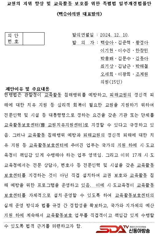 [½Åµ¿¾Æ¹æ¼Û ÀÎõ= À±¹Î½Ä±âÀÚ]±¹È¸ ±³À°À§¿øÈ¸ ¹é½Â¾Æ ÀÇ¿ø(´õºÒ¾î¹ÎÁÖ´ç)ÀÌ ±³À°È°µ¿º¸È£¼¾ÅÍÀÇ ½ÇÁ¦ ¿î¿µ ¹æ½Ä°ú ¹ý·ü ±ÔÁ¤À» ÀÏÄ¡½Ã۰í, ±¹°¡¿Í ÁöÀÚü ¿¹»ê Áö¿øÀÇ ¹ýÀû ±Ù°Å¸¦ ¸¶·ÃÇϱâ À§ÇÑ ¡¸±³¿øÀÇ ÁöÀ§ Çâ»ó ¹× ±³À°È°µ¿ º¸È£¸¦ À§ÇÑ Æ¯º°¹ý¡¹ ÀϺΰ³Á¤¹ý·ü¾ÈÀ» ¹ßÀÇÇÏ¿´´Ù.