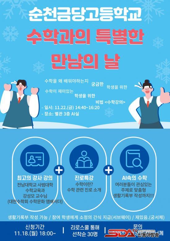À̹ø ¡®¼öÇаúÀÇ Æ¯º°ÇÑ ¸¸³²ÀÇ ³¯¡¯À» ÅëÇØ ¼øÃµ±Ý´ç°í´Â Çлýµé¿¡°Ô ¼öÇÐÀÌ °¡Áø ½Ç¿ë¼º°ú ¾Æ¸§´Ù¿òÀ» ü°¨ÇÒ ±âȸ¸¦ Á¦°øÇϸç, ¼öÇÐ ÇнÀ¿¡ ´ëÇÑ »õ·Î¿î µ¿±â¿Í Èï¹Ì¸¦ À¯¹ßÇÏ¿´´Ù. ¼øÃµ±Ý´ç°íµîÇб³´Â ¾ÕÀ¸·Îµµ ¼öÇÐÀÇ ´ëÁßÈ¿Í Ã¢ÀÇÀû »ç°í·Â Çâ»óÀ» À§ÇØ ´Ù¾çÇÑ ÇÁ·Î±×·¥À» ±âȹÇÏ°í ¿î¿µÇÒ °èȹÀÌ´Ù.