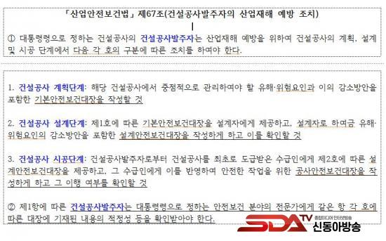 ¡à ¡¸»ê¾÷¾ÈÀüº¸°Ç¹ý¡¹ Á¦67Á¶¿¡ µû¶ó ÃÑ °ø»ç±Ý¾× 50¾ï ¿ø ÀÌ»ó °Ç¼³°ø»çÀÇ ¹ßÁÖÀÚ´Â °èȹ¡¤¼³°è¡¤½Ã°ø ´Ü°èº°·Î ¾ÈÀüº¸°Ç´ëÀåÀ» ÀÛ¼ºÇϰí, À̸¦ ¾ÈÀüº¸°Ç Àü¹®°¡¿¡°Ô ÀûÁ¤¼º °ËÁõÀ» ¹Þµµ·Ï Àǹ«ÈÇϰí ÀÖ´Ù. ÀÌ´Â ´ëÇü °Ç¼³°ø»çÀÇ ¾ÈÀüÀ» ü°èÀûÀ¸·Î °ü¸®Çϱâ À§ÇÑ ÇÙ½É ÀåÄ¡´Ù.