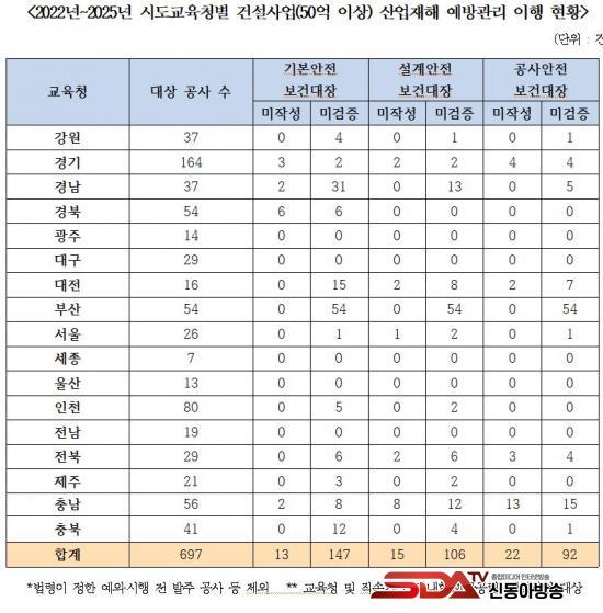 ¡à 50¾ï ¿ø ÀÌ»ó ±³À°Ã» °ü³» ´ëÇü°ø»ç¿¡¼ ÀÛ¼º¡¤°ËÁõÇØ¾ß ÇÏ´Â ¾ÈÀüº¸°Ç´ëÀå ¹ÌÀÌÇà ÇöȲÀ» º¸¸é, Àüü ´ë»ó °ø»ç 697°Ç Áß ±âº»¾ÈÀüº¸°Ç´ëÀå 160°Ç, ¼³°è¾ÈÀüº¸°Ç´ëÀå 121°Ç, °ø»ç¾ÈÀüº¸°Ç´ëÀå 114°Ç¿¡¼ ÀÛ¼º ¶Ç´Â °ËÁõÀÌ ÀÌ·ïÁöÁö ¾ÊÀº °ÍÀ¸·Î ³ªÅ¸³µ´Ù. ƯÈ÷ ºÎ»ê¡¤Ãæ³²¡¤°æ³² µî ÀϺΠ±³À°Ã»Àº ´Ù¼öÀÇ ¹ÌÀÌÇà »ç·Ê°¡ È®ÀεŠ¹ýÀû Àǹ«°¡ ÇöÀå¿¡¼ Á¦´ë·Î ÀÛµ¿ÇÏÁö ¾Ê°í ÀÖÀ½À» È®ÀÎÇß´Ù.