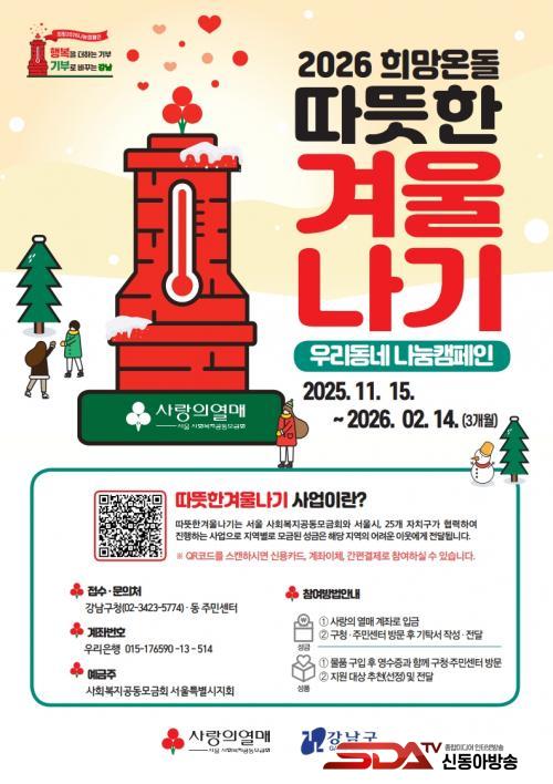 [½Åµ¿¾Æ¹æ¼Û °­³²±¸=À̽ŵ¿±âÀÚ] ²ÞÀÌ ¸ðÀÌ´Â µµ½Ã, ¹Ì·¡¸¦ ±×¸®´Â °­³²±¸°¡ 11¿ù 15ÀϺÎÅÍ ³»³â 2¿ù 14ÀϱîÁö 3°³¿ù°£ Áö¿ª ³» ¼Ò¿ÜµÈ ÀÌ¿ôµé¿¡°Ô ¿Â±â¸¦ ÀüÇÏ´Â ¡®2026 Èñ¸Á¿Âµ¹ µû¶æÇÑ °Ü¿ï³ª±â¡¯ ³ª´® Ä·ÆäÀÎÀ» º»°Ý ÃßÁøÇÑ´Ù. ¼±Æ÷½ÄÀº ¿À´Â 11¿ù 17ÀÏ ±¸Ã» º»°ü 1Ãþ ·Îºñ¿¡¼­ ¿­¸°´Ù.