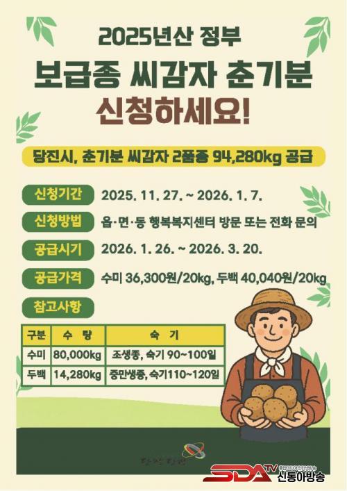 [½Åµ¿¾Æ¹æ¼Û=ÀÌÀçö±âÀÚ] ´çÁø½Ã³ó¾÷±â¼ú¼¾ÅÍ(¼ÒÀå ±è¼®±¤)´Â ³ó°¡ ¼Òµæ Áõ°¡¿Í ¾ÈÁ¤ÀûÀÎ °¨ÀÚ »ý»ê ±â¹Ý ¸¶·ÃÀ» À§ÇØ 2025³â»ê Á¤ºÎ º¸±ÞÁ¾ ¾¾°¨ÀÚ Ãá±âºÐ ½ÅûÀ» ¿À´Â 1¿ù 7ÀϱîÁö À¾¸éµ¿ ÇàÁ¤º¹Áö¼¾Å͸¦ ÅëÇØ ¹Þ´Â´Ù°í 1ÀÏ ¹àÇû´Ù.