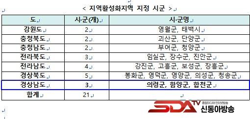 [½Åµ¿¾Æ¹æ¼Û °æ³²=³²±Ã¿µ±â±âÀÚ] °æ»ó³²µµ´Â Áö³­ 10¿ù ÀÇ·ÚÇÑ ÀÇ·É, ÇÔ¾ç, ÇÕõ 3°³ ±ºÀÇ Áö¿ªÈ°¼ºÈ­Áö¿ª ÁöÁ¤¿¡ ´ëÇÏ¿©, ±¹ÅäºÎ¿¡¼­ 12¿ù 30ÀÏ ÀÚ·Î ÁöÁ¤ÇÑ´Ù°í ¹àÇû´Ù.