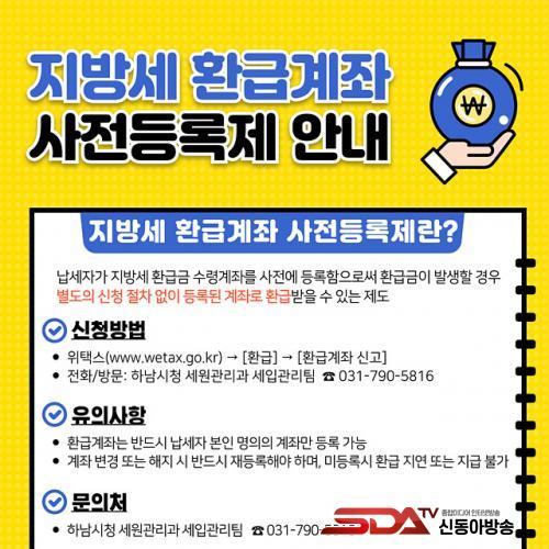 Áö¹æ¼¼ ȯ±Þ°èÁ »çÀüµî·ÏÀº À§Åýº(www.wetax.go.kr) ȨÆäÀÌÁö ¶Ç´Â ¸ð¹ÙÀÏ ¾ÛÀ» ÅëÇØ ½ÅûÇÒ ¼ö ÀÖÀ¸¸ç, Çϳ²½Ãû ¼¼¿ø°ü¸®°ú ¼¼ÀÔ°ü¸®ÆÀÀ» ¹æ¹®Çϰųª ÀüÈ(031-790-5816)·Îµµ ½ÅûÇÒ ¼ö ÀÖ´Ù. ȯ±Þ°èÁ´ ³³¼¼ÀÚ º»ÀÎ ¸íÀÇ °èÁ¸¸ µî·Ï °¡´ÉÇϸç, °èÁ º¯°æ ¶Ç´Â ÇØÁö ½Ã¿¡´Â ¹Ýµå½Ã Àçµî·ÏÇØ¾ß ÇÑ´Ù.