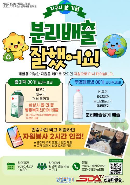À̹ø Ȱµ¿Àº Áö±¸ÀÇ ³¯À» ±â³äÇÏ´Â ÀÏȸ¼º Çà»ç¸¦ ³Ñ¾î, ½Ã¹ÎµéÀÌ ÀçȰ¿ë ÀÚ¿øÀÇ °¡Ä¡¸¦ ÀνÄÇÏ°í ¿Ã¹Ù¸¥ ºÐ¸®¹èÃâÀ» »ýȰ ½À°üÀ¸·Î Á¤Âø½Ã۱â À§ÇØ ¸¶·ÃµÆ´Ù. Ä·ÆäÀÎÀº 4¿ù 20ÀϺÎÅÍ 6¿ù 30ÀϱîÁö ¾à 70Àϰ£ ÁøÇàµÇ¸ç ÀÚ¿ø¼øÈ¯¿¡ °ü½É ÀÖ´Â ½Ã¹ÎÀ̶ó¸é ´©±¸³ª Âü¿© °¡´ÉÇÏ´Ù.
