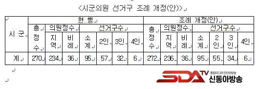 ½Ã±ºÀÇ¿ø ÃÑÁ¤¼ö´Â ¡¸°øÁ÷¼±°Å¹ý¡¹ °³Á¤¿¡ µû¶ó ÇöÇàÁ¤¼ö 270¸í¿¡¼ 2¸í ´Ã¾î³ 272¸í(Áö¿ª±¸ 236, ºñ·Ê´ëÇ¥ 36)À¸·Î °áÁ¤µÆ´Ù. Ã¥Á¤±âÁØÀº ½Ã±ºº°·Î ±âº»Á¤¼ö¸¦ 7ÀÎÀ¸·Î µÎ°í Àα¸¼ö 60%, À¾¸éµ¿¼ö 40%¸¦ Àû¿ëÇϵÇ, Àα¸ Áõ°¡, ÀÇ¿ø 1Àδç Àα¸ µîÀ» °í·ÁÇß´Ù.