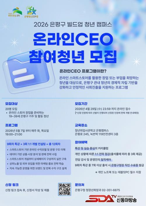 ÇÁ·Î±×·¥Àº ´ÙÀ½ ´Þ 7ÀϺÎÅÍ ÁÖ 2ȸ ¿î¿µµÈ´Ù. ¸ðÁý ´ë»óÀº ¿Â¶óÀÎ ½ºÅä¾î â¾÷¡¤ºÎ¾÷À» ÁغñÇÏ´Â 19¼¼ºÎÅÍ 39¼¼±îÁö û³âÀ¸·Î, ÀºÆò±¸ °ÅÁÖÀÚ¸¦ ¿ì¼± ¼±¹ßÇØ ÃÑ 20¸íÀ» ¸ðÁýÇÑ´Ù. ½ÅûÀº È«º¸¹° ³» Å¥¾Ë(QR)Äڵ带 ÅëÇØ ¿Â¶óÀÎÀ¸·Î Á¢¼öÇÏ¸é µÈ´Ù.