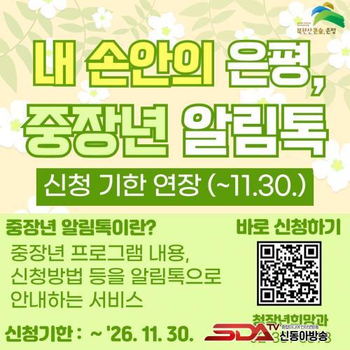 ¡®³» ¼Õ¾ÈÀÇ ÀºÆò, ÁßÀå³â ¾Ë¸²Å塯Àº ÀºÆò±¸ ÁßÀå³âÀ» ´ë»óÀ¸·Î ±³À°, Çà»ç, Ãë¾÷ ÇÁ·Î±×·¥ ¸ðÁý ½Ã ÀÏÁ¤°ú ½Åû ¹æ¹ý µîÀ» »çÀü¿¡ ¾È³»ÇÏ´Â ¼ºñ½º´Ù. ÁßÀå³âÃþÀÇ Á¤º¸ Á¢±Ù¼ºÀ» ³ôÀÌ°í »çȸ Âü¿©¸¦ µ½±â À§ÇØ ¸¶·ÃµÆ´Ù.