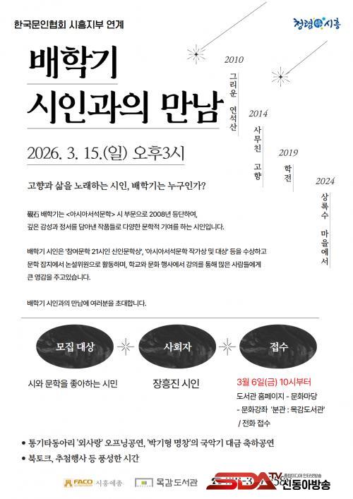 À̹ø ¸¸³²Àº 3¿ù 15ÀÏ ¿ÀÈÄ 3½Ã, ¸ñ°¨µµ¼­°ü ÁöÇÏ 1Ãþ ´Ù¸ñÀû½Ç¿¡¼­ ÁøÇàµÇ¸ç, ½Ã¿Í ¹®Çп¡ °ü½ÉÀÌ ÀÖ´Â 50¿© ¸íÀÇ ½Ã¹Î°ú ÇÔ²²ÇÑ´Ù. ½ÃÀÎÀÌ Á÷Á¢ ÀÚ½ÅÀÇ ÀÛǰÀ» ³¶µ¶Çϰí, ½Ã¸¦ ¾²°Ô µÈ °è±â¿Í âÀÛ °úÁ¤¿¡ °üÇÑ À̾߱⸦ µé·ÁÁÙ ¿¹Á¤ÀÌ´Ù. ¶ÇÇÑ, ½Ã¹Îµé°ú ÀÚÀ¯·Ó°Ô Áú¹®À» ³ª´©¸ç ½Ã¿Í »î¿¡ ´ëÇØ Æí¾ÈÇÏ°Ô ´ëÈ­ÇÏ´Â ½Ã°£µµ ¸¶·ÃµÈ´Ù.