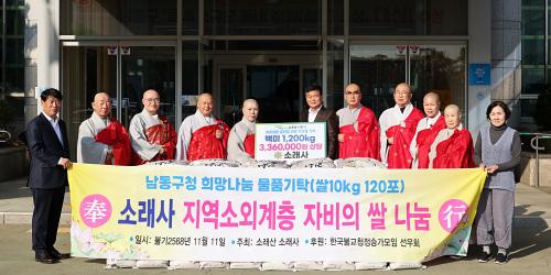 [½Åµ¿¾Æ¹æ¼Û ÀÎõ= À±¹Î½Ä±âÀÚ] ÀÎõ½Ã ³²µ¿±¸´Â ¼Ò·¡»ç·ÎºÎÅÍ Áö¿ª»çȸÀÇ Ãë¾à°èÃþÀ» À§ÇÑ ¹é¹Ì 1,200kg(336¸¸ ¿ø »ó´ç)À» ±âŹ¹Þ¾Ò´Ù°í 13ÀÏ ¹àÇû´Ù. À̹ø¿¡ ±âʹÞÀº ½ÒÀº ŰíÁ¾ ½º´ÔºÀ»çȸ ¸ðÀÓÀΡ®¼±¿ìȸ(ȸÀå ¼ºÇؽº´Ô)¡¯¿Í ¼Ò·¡»çÀÇ ÈÄ¿øÇ°À¸·Î ÀÎõ»çȸ¡¦