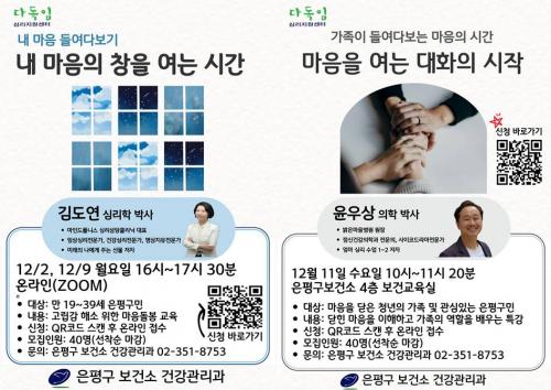[½Åµ¿¾Æ¹æ¼Û ÀºÆò±¸=À̽ŵ¿±âÀÚ] ÀºÆò±¸´Â ±¸¹ÎÀÇ ¸¶À½ °Ç°­À» À§ÇÑ ¼ÒÅë ÇÁ·Î±×·¥À¸·Î ¡®³» ¸¶À½ÀÇ Ã¢À» ¿©´Â ½Ã°£¡¯°ú ¡®¸¶À½À» ¿©´Â ´ëÈ­ÀÇ ½ÃÀÛ¡¯À» ¿î¿µÇϰí, ¼±Âø¼ø Á¢¼öÇÑ´Ù°í ¹àÇû´Ù. À̹ø ÇÁ·Î±×·¥Àº û³â°ú °¡Á· °£ÀÇ ÀÌÇØ¿Í °ø°¨À» µ½°í, ½É¸®Àû ¾î·Á¿ò ¼Ó¡¦