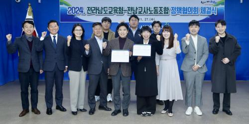 [½Åµ¿¾Æ¹æ¼Û Àü³²=À̽ŵ¿±âÀÚ] Àü¶ó³²µµ±³À°Ã»°ú Àü³²±³»ç³ëµ¿Á¶ÇÕÀº 27ÀÏ Àü¶ó³²µµ±³À°Ã» ÁßȸÀǽǿ¡¼­ ³ë»ç ¾çÃø °ü°èÀÚµéÀÌ Âü¼®ÇÑ °¡¿îµ¥ ¡®2024³â Á¤Ã¥ÇùÀÇȸ ü°á½Ä¡¯À» °¡Á³´Ù. ³ë¡¤»ç ¾çÃøÀº À̹ø Á¤Ã¥ÇùÀǸ¦ ÅëÇØ ±³»ç º»Áú¾÷¹« ȸº¹ ¹× ó¿ì°³¼±, ±³¿øÀλ硦