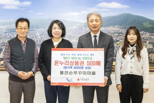 [½Åµ¿¾Æ¹æ¼Û ÀÎõ= À±¹Î½Ä±âÀÚ]ÀÎõ±¤¿ª½Ã °è¾ç±¸(±¸Ã»Àå À±È¯)´Â Áö³­ 5ÀÏ °è»êµ¿ ¼ÒÀç ÅëÅ«¼ÕÂ޲ٹ̸¶À» °è»êº»Á¡(´ëÇ¥ ¹èÇö¹è)°¡ Áö¿ª °æ·Î´ç ¾î¸£½Å Áö¿øÀ» À§ÇÑ ¿Â´©¸®»óǰ±Ç 500¸Å(ȯ°¡¾× 500¸¸ ¿ø)¸¦ ±âŹÇß´Ù°í ¹àÇû´Ù. ¡®ÅëÅ«¼ÕÂ޲ٹ̸¶À» °è»êº»Á¡¡¯Àº Æò¡¦