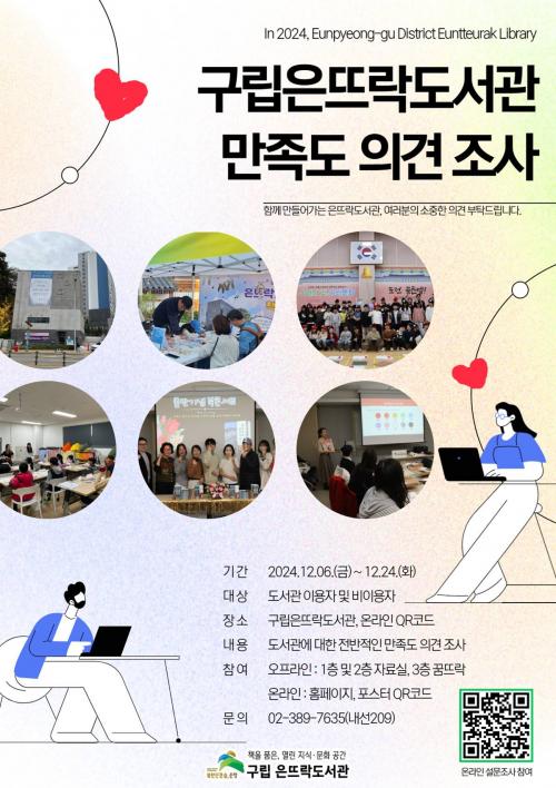 [½Åµ¿¾Æ¹æ¼Û ÀºÆò±¸=À̽ŵ¿±âÀÚ] ÀºÆò±¸´Â ±¸¸³ Àº¶ß¶ôµµ¼­°üÀÌ µµ¼­°ü ÀÌ¿ëÀÚ¿Í ºñÀÌ¿ëÀÚ¸¦ ´ë»óÀ¸·Î µµ¼­°ü ¼­ºñ½º ¸¸Á·µµ ÀÇ°ß Á¶»ç¸¦ ¿À´Â 24ÀϱîÁö ½Ç½ÃÇÑ´Ù°í ¹àÇû´Ù. ¸¸Á·µµ Á¶»ç´Â µµ¼­°üÀÇ ÀÌ¿ë °æÇè, ¼ÒÀåÀÚ·á, ¹®È­ÇÁ·Î±×·¥, ÀÌ¿ë ȯ°æ, ¿Â¶óÀÎ ¼­ºñ½º, Àü¡¦