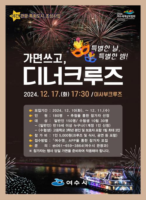 [½Åµ¿¾Æ¹æ¼ÛÀü³²¿©¼ö=±è±â³² ±âÀÚ] ¿©¼ö½Ã(½ÃÀå Á¤±â¸í)°¡ ¾ß°£°ü±¤ üÇè ÇÁ·Î±×·¥À¸·Î ¿À´Â 17ÀÏ ¿ÀÈÄ 5½Ã 30ºÐ ¡®ÀÌ»çºÎÅ©·çÁ¿¡¼­ ¡®ÇÁ¶óÀ̺ø µð³ÊÅ©·çÁ¸¦ ¿î¿µÇÑ´Ù. ¡®ÇÁ¶óÀ̺ø µð³ÊÅ©·çÁ´Â °¡¸éÀ» ¾²°í ¿©¼ö ¹ã¹Ù´Ù¸¦ ¸¸³£ÇÏ´Â ¾ß°£°ü±¤ Ưȭµµ½Ã °ü¡¦