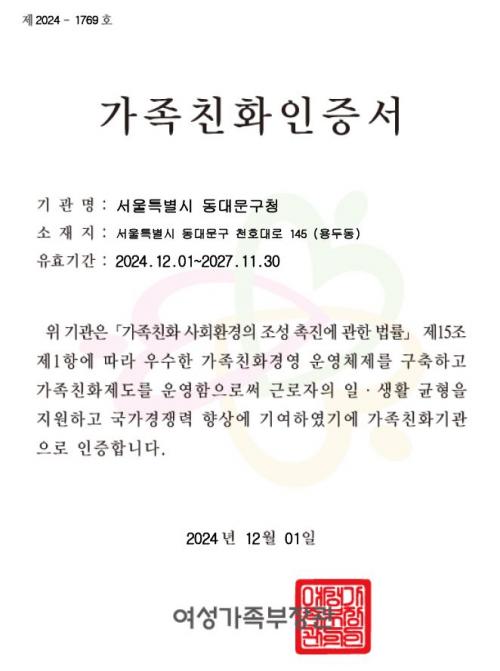 [½Åµ¿¾Æ¹æ¼Û µ¿´ë¹®±¸=À̽ŵ¿±âÀÚ] ¼­¿ï µ¿´ë¹®±¸°¡ 12¿ù 1ÀÏ ¿©¼º°¡Á·ºÎ ¡®°¡Á·Ä£È­±â°ü¡¯À¸·Î ÀçÀÎÁõ ¹Þ¾Ò´Ù. 2013³â °¡Á·Ä£È­±â°üÀ¸·Î ÃÖÃÊ ÀÎÁõµÈ µ¿´ë¹®±¸´Â À̹ø ÀÎÁõÀ¸·Î 2027³â 11¿ù 30ÀϱîÁö ¸í¿¹¸¦ À¯ÁöÇÏ°Ô µÆ´Ù. ¡®°¡Á·Ä£È­ÀÎÁõ¡¯À̶õ À¯¿¬±Ù¹«Á¦µµ, ÀÚ¡¦
