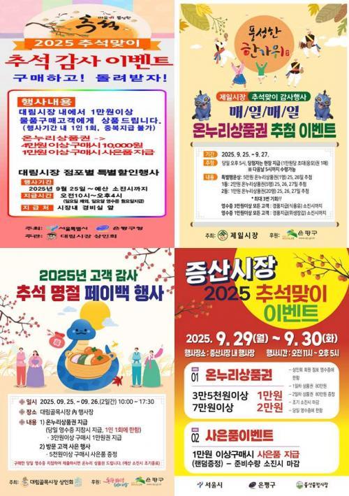 [½Åµ¿¾Æ¹æ¼Û ÀºÆò±¸=À̽ŵ¿±âÀÚ] ¼­¿ï ÀºÆò±¸´Â ¿À´Â 25ÀϺÎÅÍ ³»´Þ 13ÀϱîÁö °ü³» ÀüÅë½ÃÀå¿¡¼­ ´Ù¾çÇÑ Ãß¼® ¸íÀý À̺¥Æ®¸¦ ÁøÇàÇÑ´Ù°í ¹àÇû´Ù. À̹ø Çà»ç´Â ´ë¸²½ÃÀå, Á¦ÀϽÃÀå, ´ëÁ¶½ÃÀå, ´ë¸²°ñ¸ñ½ÃÀå, Áõ»êÁ¾ÇÕ½ÃÀå¿¡¼­ °³ÃֵǸç ÀüÅë½ÃÀå Ȱ¼ºÈ­¿Í ÁֹΠÂü¿© È®¡¦