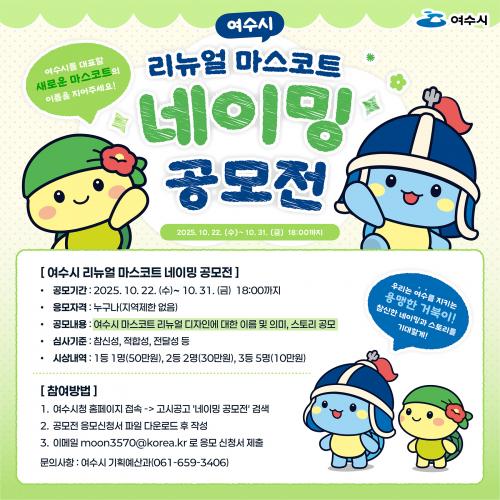 [½Åµ¿¾Æ¹æ¼Û ¿©¼ö=±è±â³² ±âÀÚ] ¿©¼ö½Ã(½ÃÀå Á¤±â¸í)´Â 10¿ù 22ÀϺÎÅÍ 31ÀϱîÁö ¡®¿©¼ö½Ã ¸®´º¾ó ¸¶½ºÄÚÆ® ³×ÀÌ¹Ö °ø¸ðÀü¡¯À» °³ÃÖÇÑ´Ù. À̹ø °ø¸ðÀüÀº Áö³­ 9¿ù ½Ç½ÃÇÑ ´ë±¹¹Î ¼±È£µµ Á¶»ç °á°ú¸¦ ¹ÙÅÁÀ¸·Î ÃÖÁ¾ º¸¿Ï¡¤¹ßÀüµÈ ¸¶½ºÄÚÆ® µðÀÚÀÎÀ» ½Ã¹Î¿¡°Ô °ø°³ÇÏ°í¡¦
