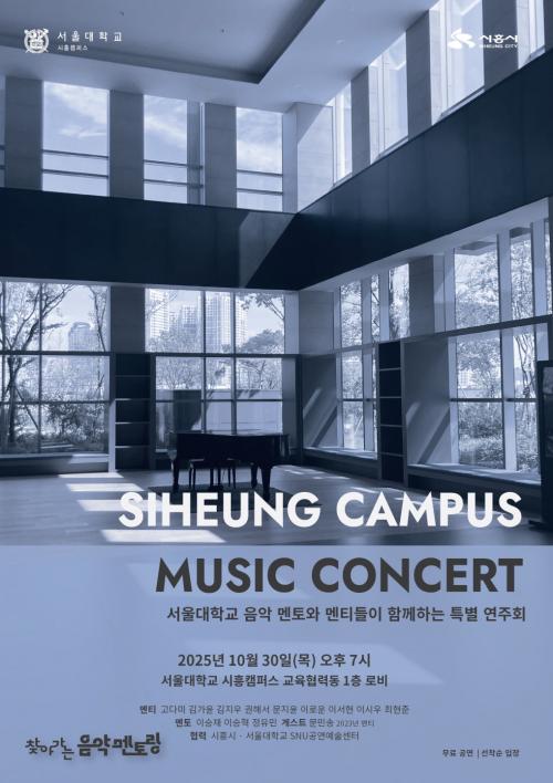 [½Åµ¿¾Æ¹æ¼Û ½ÃÈï½Ã=À̽ŵ¿±âÀÚ] ¼­¿ï´ëÇб³ ½ÃÈïÄ·ÆÛ½º¿Í ½ÃÈï½Ã°¡ Çù·ÂÇÏ´Â ¡®¼­¿ï´ëÇб³ À½¾Ç ¸àÅä-¸àƼ Ưº° ¿¬ÁÖȸ¡¯°¡ 10¿ù 30ÀÏ ¿ÀÈÄ 7½Ã, ¼­¿ï´ëÇб³ ½ÃÈïÄ·ÆÛ½º ±³À°Çù·Âµ¿ 1Ãþ ·Îºñ(½ÃÈï½Ã ¼­¿ï´ëÇзΠ173)¿¡¼­ ¿­¸°´Ù. À̹ø °ø¿¬Àº ¼­¿ï´ëÇб³ À½¾Ç´ëÇÐ À硦