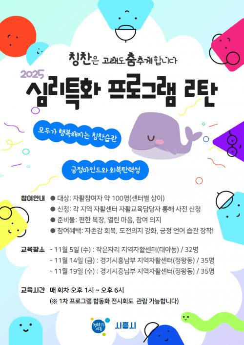 [½Åµ¿¾Æ¹æ¼Û ½ÃÈï½Ã=À̽ŵ¿±âÀÚ] ½ÃÈï½Ã´Â ÀÚȰÂü¿©ÀÚÀÇ Á¤¼­Àû ¿ª·® °­È­¸¦ À§ÇØ Áö³­ 11¿ù 5ÀÏ ¡®2025³â ÀÚȰÂü¿©ÀÚ ½É¸®Æ¯È­ ÇÁ·Î±×·¥ 2ꡝÀ» ´ë¾ßµ¿°ú Á¤¿Õµ¿¿¡¼­ ÁøÇàÇß´Ù. À̹ø ÇÁ·Î±×·¥Àº ¼¾Åͺ° ã¾Æ°¡´Â ¿öÅ©¼ó ¹æ½ÄÀ¸·Î ¿î¿µµÅ, Âü¿©ÀÚµéÀÌ Àϻ󿡼­µµ ½±°Ô ¡¦