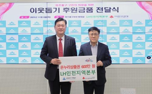 [½Åµ¿¾Æ¹æ¼Û ÀÎõ=À±¹Î½Ä±âÀÚ]ÀÎõ ¹ÌÃßȦ±¸(±¸Ã»Àå ÀÌ¿µÈÆ)´Â 6ÀÏ ±¸Ã»Àå½Ç¿¡¼­ Çѱ¹ÅäÁöÁÖÅðø»ç(LH) ÀÎõÁö¿ªº»ºÎ(º»ºÎÀå ¼­È¯½Ä)·ÎºÎÅÍ ¾Æµ¿º¹Áö½Ã¼³ Áö¿øÀ» À§ÇÑ ¿Â´©¸®»óǰ±Ç 600¸¸ ¿øÀ» Àü´Þ¹Þ¾Ò´Ù. À̹ø ÈÄ¿øÀº Áö¿ª ³» ¾Æµ¿º¹Áö½Ã¼³ÀÇ È¯°æÀ» °³¼±ÇÏ°í ¾Æ¡¦
