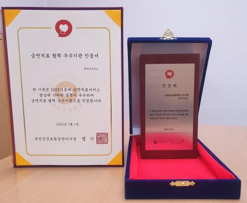 [½Åµ¿¾Æ¹æ¼Û °æ³²ÇÔ¾È=À̽ŵ¿±âÀÚ] ÇԾȱºº¸°Ç¼Ò´Â ±¹¹Î°Ç°­º¸Çè°ø´ÜÀÌ ÁÖ°üÇÑ 2025³â ±Ý¿¬Ä¡·áÁö¿ø»ç¾÷ Æò°¡¿¡¼­ ¡®±Ý¿¬Ä¡·á Çù·Â ¿ì¼ö±â°ü¡¯¿¡ ¼±Á¤µÅ ÀÎÁõ¼­¿Í ÀÎÁõÆÐ¸¦ ¹Þ¾Ò´Ù. ¡®±Ý¿¬Ä¡·á Çù·Â ¿ì¼ö±â°ü¡¯Àº »ç¾÷ Âü¿©µµ¿Í ±Ý¿¬Ä¡·á À̼öÀÚ ¼ö, ¹®ÁøÇ¥ ÀÔ·Â ½Ç¡¦