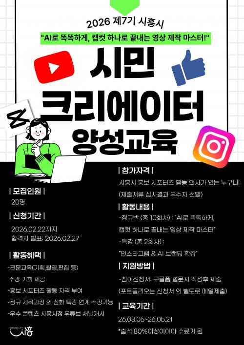 [½Åµ¿¾Æ¹æ¼Û ½ÃÈï½Ã=À̽ŵ¿±âÀÚ] ½ÃÈï½Ã´Â ½Ã¹Î Âü¿©Çü È«º¸¸¦ Ȱ¼ºÈ­ÇÏ°í ½Ã¹ÎÀÌ ¸¸µå´Â ÄÜÅÙÃ÷¸¦ ¹ß±¼¤ýÈ®»êÇϱâ À§ÇØ ¡®2026 Á¦7±â ½Ã¹Î Å©¸®¿¡ÀÌÅÍ(âÀÛÀÚ) ¾ç¼º ±³À°¡¯À» ¿î¿µÇÏ´Â °¡¿îµ¥ Âü°¡ÀÚ 20¸íÀ» 2¿ù 2ÀϺÎÅÍ 22ÀϱîÁö ¸ðÁýÇÑ´Ù. À̹ø ±³À°Àº ½Ã¹Î Å©¸®¿¡¡¦
