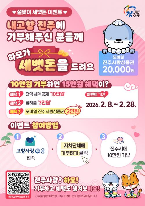 [½Åµ¿¾Æ¹æ¼Û °æ³²ÁøÁÖ=³²±Ã¿µ±â±âÀÚ] ÁøÁֽô 4ÀÏ ¼³ ¸íÀýÀ» ¸Â¾Æ ¿À´Â 2¿ù 8ÀϺÎÅÍ 2¿ù 28ÀϱîÁö¡®¼³¸ÂÀÌ °íÇâ»ç¶û±âºÎÁ¦ Ưº° À̺¥Æ®¡¯¸¦ ÁøÇàÇÑ´Ù°í ¹àÇû´Ù. À̹ø À̺¥Æ®´Â ¼³ ¸íÀý °íÇâ ÁøÁÖ¸¦ ãÀº ±Í¼º°´¿¡ ´ëÇÑ È¯¿µ°ú °¨»çÀÇ ¶æÀ» ÀüÇϰí, 2¿ù ¿¬¸»Á¤»ê ½Ã±â¡¦
