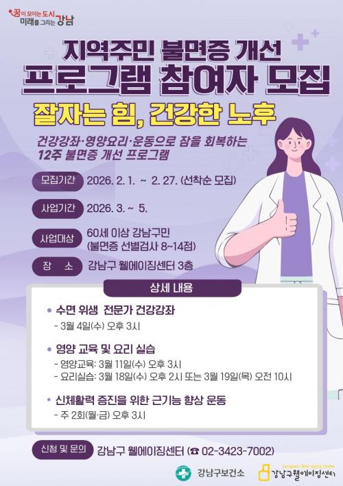 [½Åµ¿¾Æ¹æ¼Û °­³²±¸=À̽ŵ¿±âÀÚ] ²ÞÀÌ ¸ðÀÌ´Â µµ½Ã, ¹Ì·¡¸¦ ±×¸®´Â °­³²±¸°¡ 60¼¼ ÀÌ»ó ±¸¹ÎÀ» ´ë»óÀ¸·Î ¼ö¸é ¹®Á¦ °³¼±°ú °Ç°­ÇÑ »ýȰ½À°ü Çü¼ºÀ» Áö¿øÇÏ´Â ¡®ºÒ¸éÁõ °³¼±»ç¾÷¡¯À» 3¿ùºÎÅÍ °­³²±¸À£¿¡ÀÌ¡¼¾ÅÍ¿¡¼­ ¿î¿µÇÑ´Ù. ³ë³â±â¿¡´Â ºÒ¸é Áõ»ó°ú ¼ö¸éÀÇ Áú ÀúÇÏ¡¦