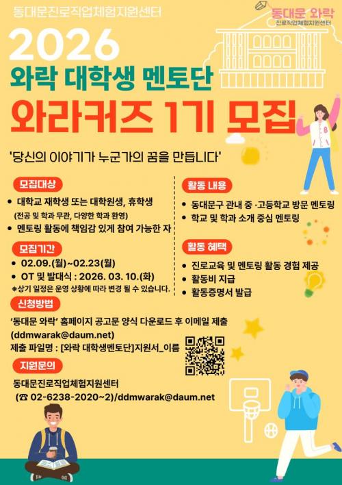 [½Åµ¿¾Æ¹æ¼Û µ¿´ë¹®±¸=À̽ŵ¿±âÀÚ] µ¿´ë¹®±¸°¡ À§Å¹ ¿î¿µÇÏ´Â Áø·ÎÁ÷¾÷üÇèÁö¿ø¼¾ÅÍ ¿Í¶ô(ÀÌÇÏ ¿Í¶ô)Àº µ¿´ë¹®±¸ û¼Ò³âµéÀÇ Áø·Î Ž»öÀ» Áö¿øÇϱâ À§ÇØ ¸àÅä´Ü ¡¸¿Í¶óÄ¿Áî(WARAKERS)¡¹ 1±â¸¦ °ø°³ ¸ðÁýÇÑ´Ù. ¿Í¶óÄ¿Áî(WARAKERS)´Â ¡®¿Í¶ô(WARAK)¡¯°ú ¡®-ers¡¯¸¦ °áÇÕÇÑ¡¦