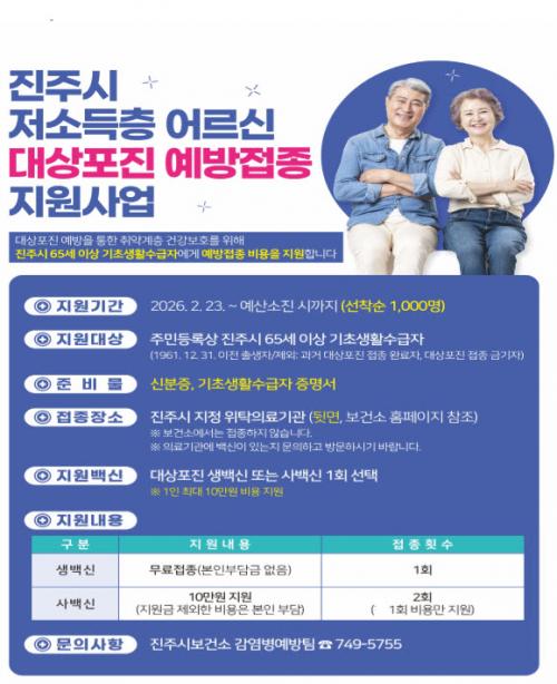 [½Åµ¿¾Æ¹æ¼Û °æ³²ÁøÁÖ=³²±Ã¿µ±â±âÀÚ] ÁøÁֽô 2¿ù 23ÀϺÎÅÍ 65¼¼ ÀÌ»ó Ãë¾à°èÃþ(±âÃÊ»ýȰ¼ö±ÞÀÚ) 1,000¸íÀ» ´ë»óÀ¸·Î ¡®´ë»óÆ÷Áø ¿¹¹æÁ¢Á¾ Áö¿ø»ç¾÷¡¯À» ½Ç½Ã ÇÑ´Ù°í ¹àÇû´Ù. À̹ø »ç¾÷Àº 2025³âºÎÅÍ ÁøÁֽð¡ »õ·Ó°Ô µµÀÔÇØ Áö¼ÓÀûÀ¸·Î ÃßÁø ÁßÀÎ »ç¾÷À¸·Î, °æÁ¦Àû¡¦